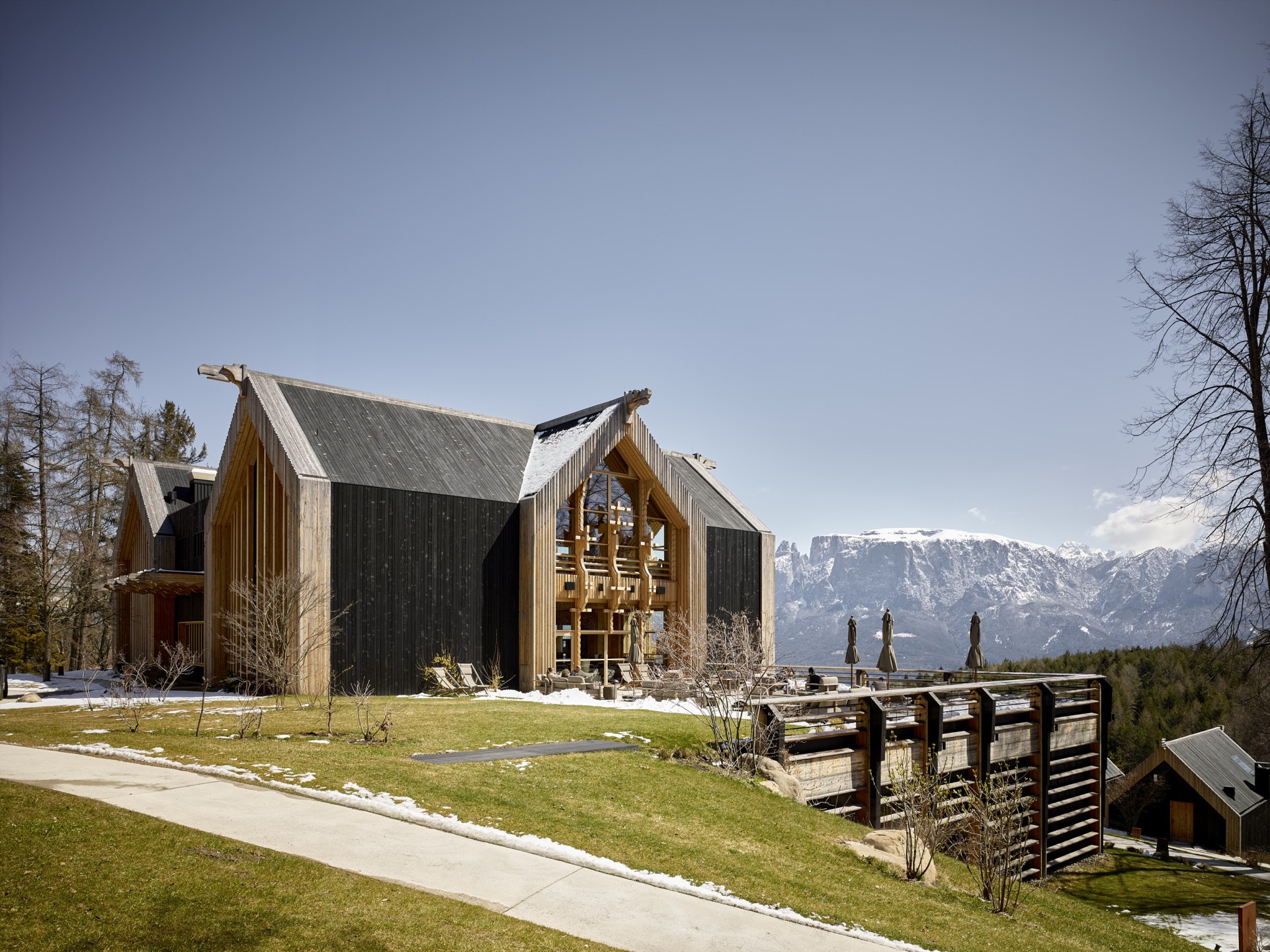 Signé par l’architecte Hugo Demetz, le projet interprète les codes de la bio-architecture avec cohérence et mesure. De nombreuses références évoquent également la culture locale et l’œuvre de l’architecte autrichien Clemens Holzmeister, qui conçut en 1926 l’aile principale de l’hôtel Adler à Ortisei.