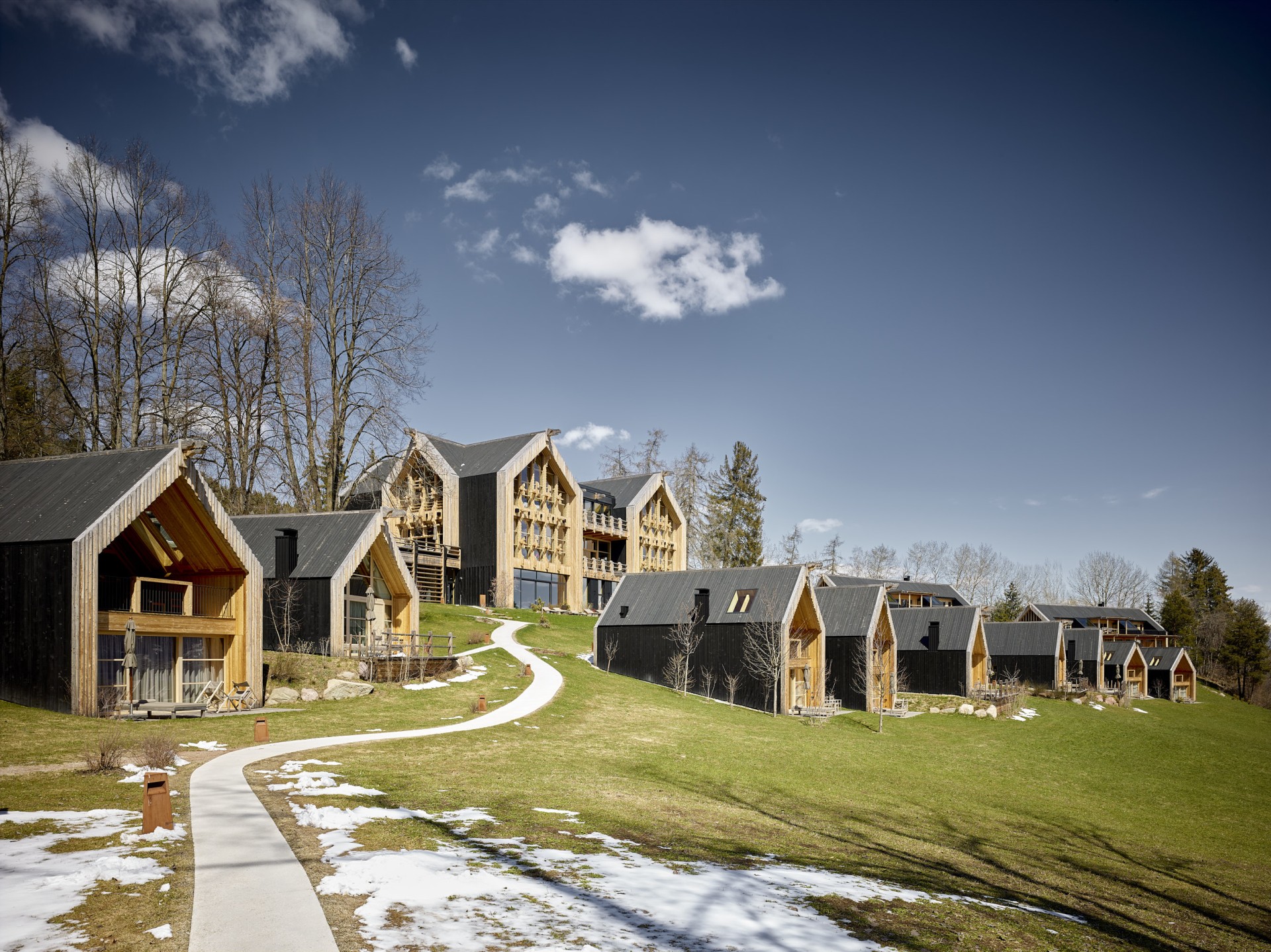 Le resort est organisé comme une constellation de volumes : le Main Lodge, sur trois niveaux, accueille les espaces communs et la zone bien-être ; deux pavillons abritent vingt suites junior équipées de bio-sauna ; et vingt chalets indépendants donnent sur l’eau, chacun doté d’une cheminée et d’un sauna privé. L’ensemble se développe en dialogue avec la forêt, les volumes en bois s’intégrant à la nature sans aucun effet scénique. Tout autour, seulement des arbres et du calme.