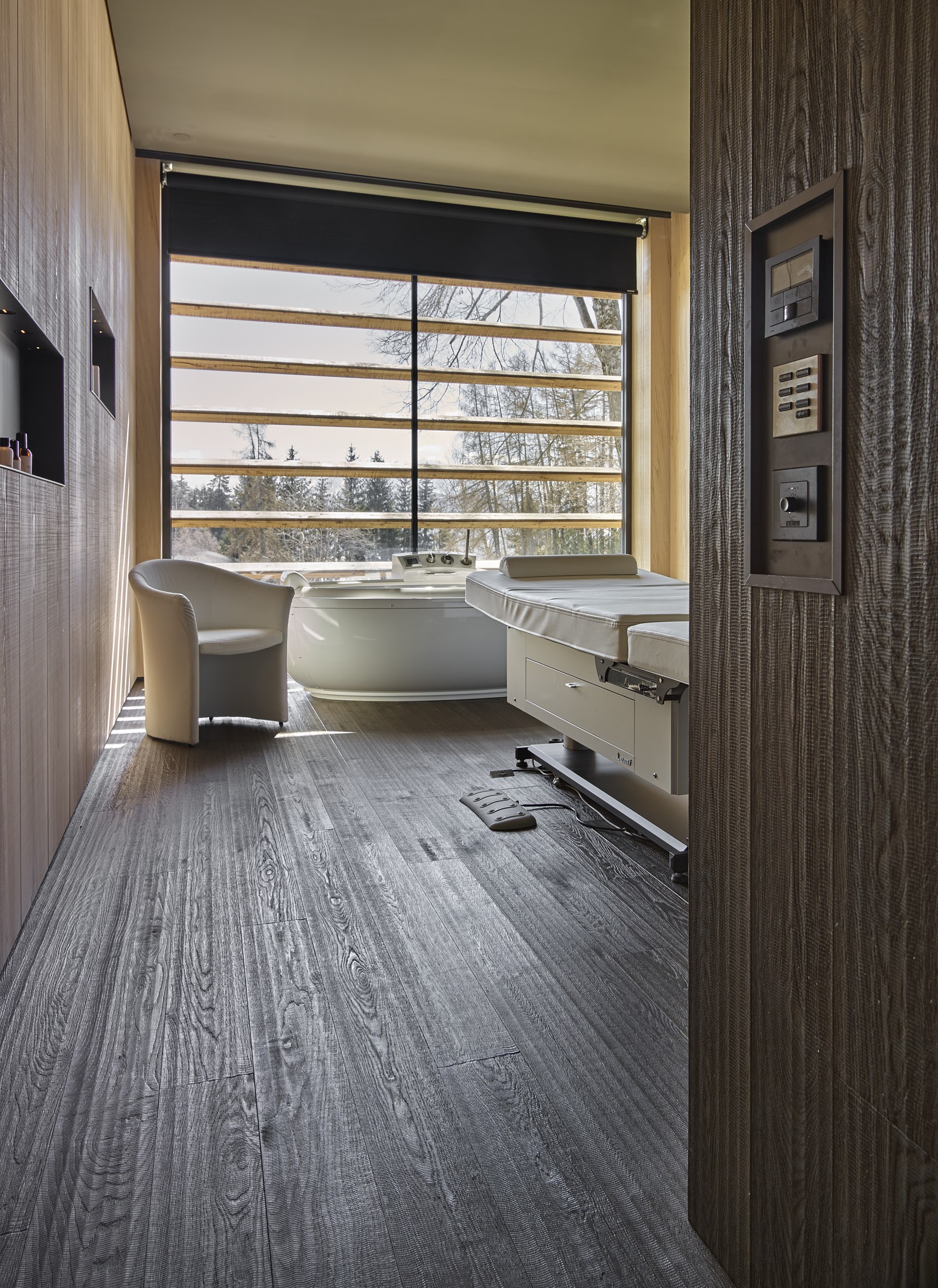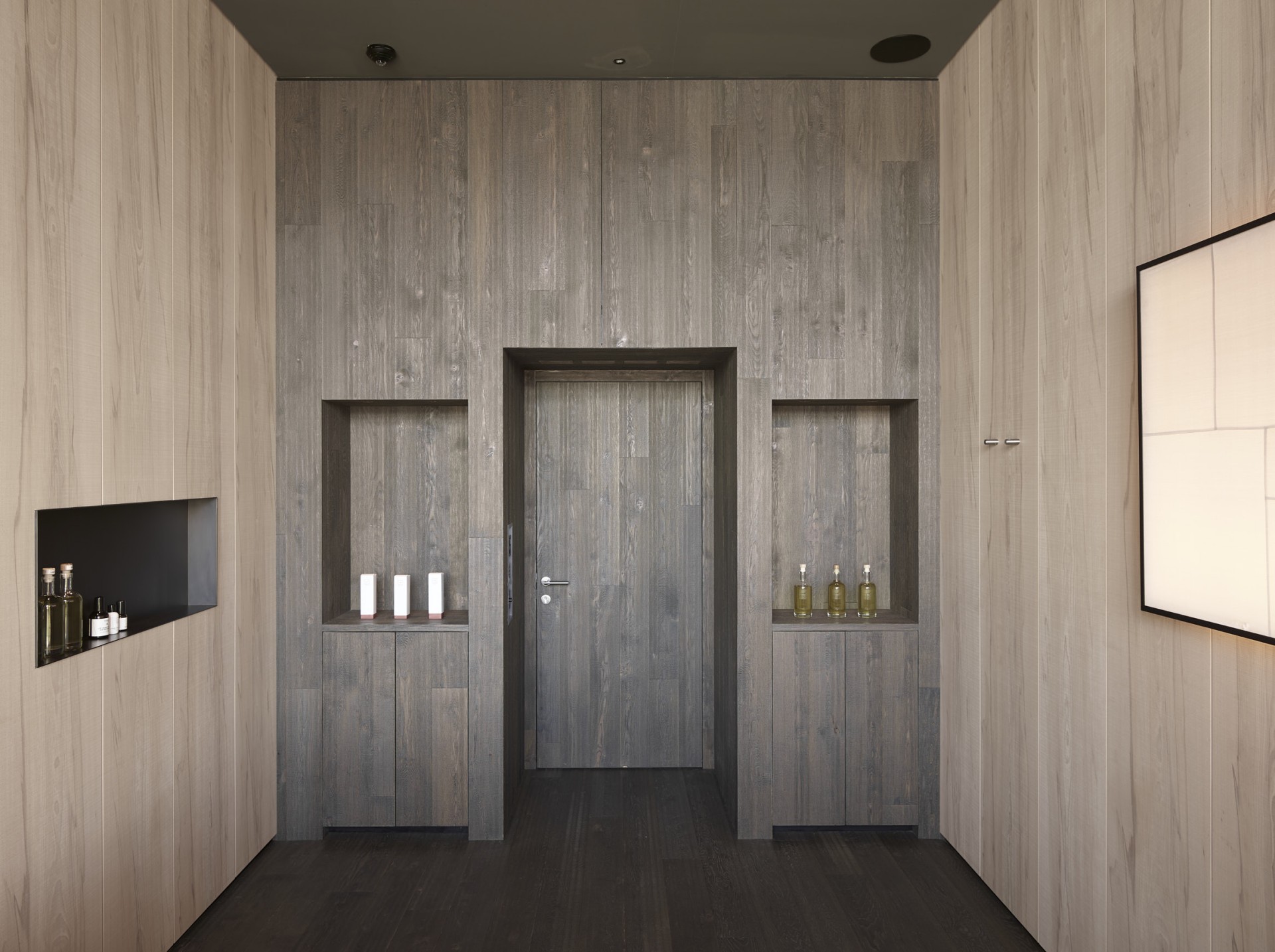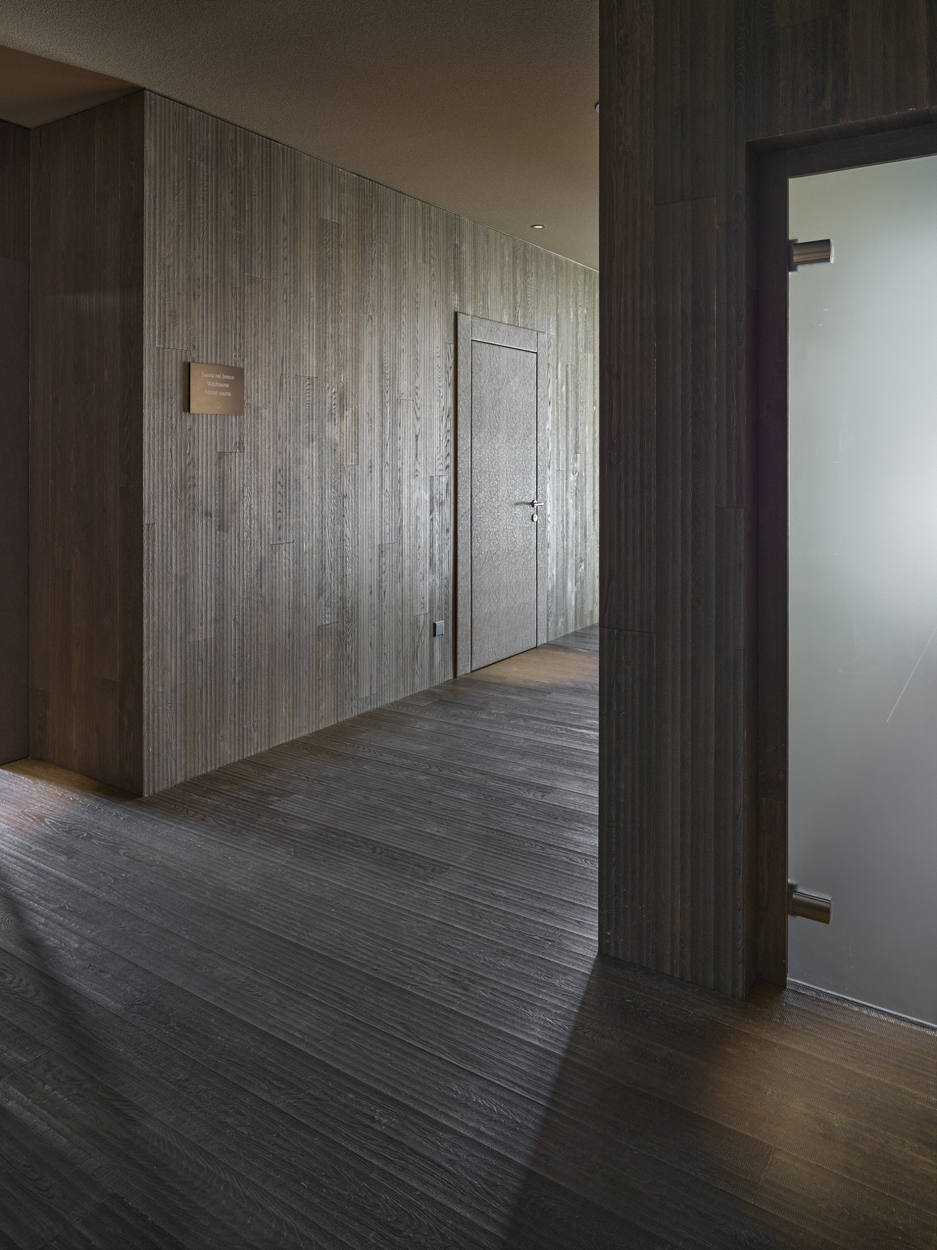 Au rez-de-chaussée du bâtiment principal s’ouvrent le spa, la piscine, le hammam et la salle de fitness : des espaces dédiés au bien-être, où le regard circule entre intérieur et extérieur sans rupture. Ici, où l’eau rencontre la chaleur et où le corps se régénère, le matériau doit être sain, accueillant, mais aussi technique. C’est pourquoi le bois de Fiemme Tremila a été choisi, réalisé sur mesure grâce au projet Bottega. Un chêne noueux vieilli à finition Pianosega, très douce au toucher, posé sur les sols, boiseries et plafonds : un support vivant, visuellement chaleureux, qui accompagne le temps et l’absorbe.