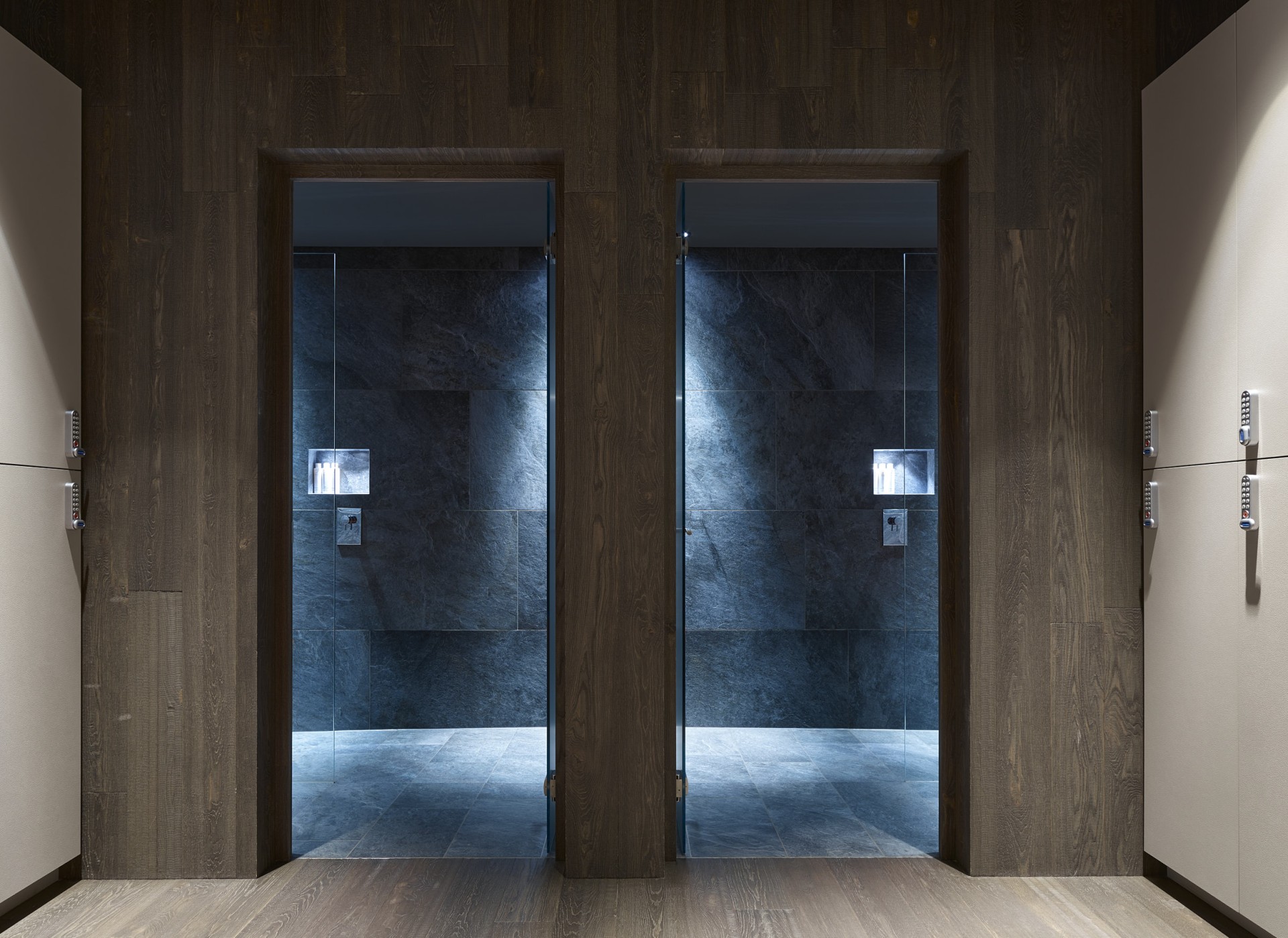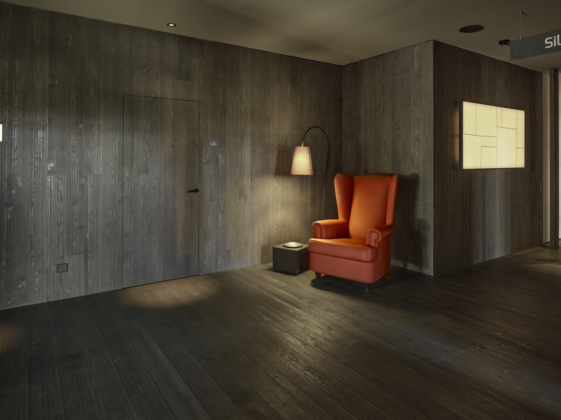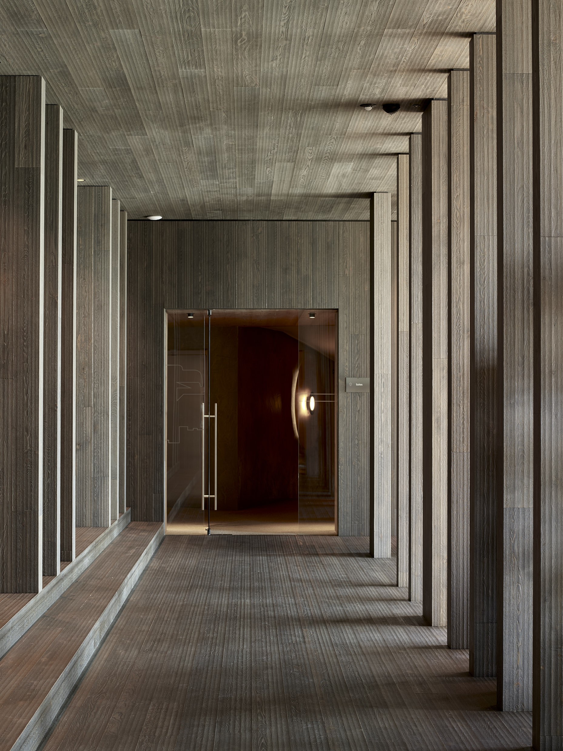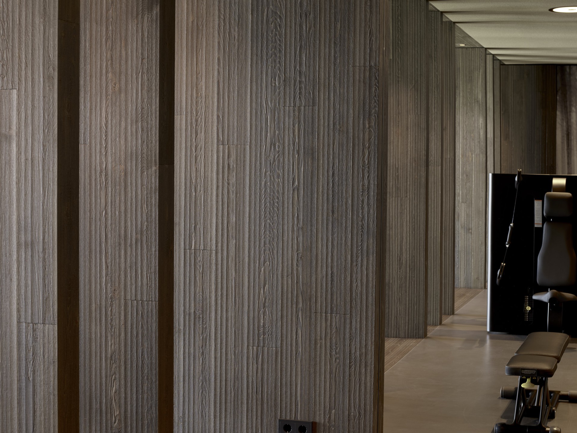 Au rez-de-chaussée du bâtiment principal s’ouvrent le spa, la piscine, le hammam et la salle de fitness : des espaces dédiés au bien-être, où le regard circule entre intérieur et extérieur sans rupture. Ici, où l’eau rencontre la chaleur et où le corps se régénère, le matériau doit être sain, accueillant, mais aussi technique. C’est pourquoi le bois de Fiemme Tremila a été choisi, réalisé sur mesure grâce au projet Bottega. Un chêne noueux vieilli à finition Pianosega, très douce au toucher, posé sur les sols, boiseries et plafonds : un support vivant, visuellement chaleureux, qui accompagne le temps et l’absorbe.