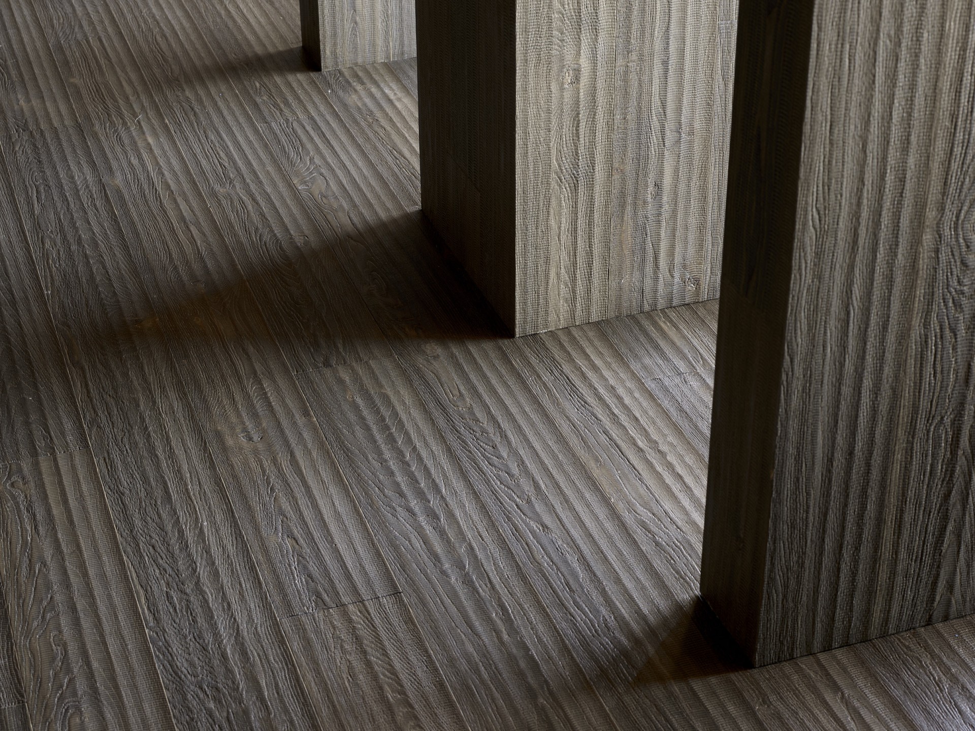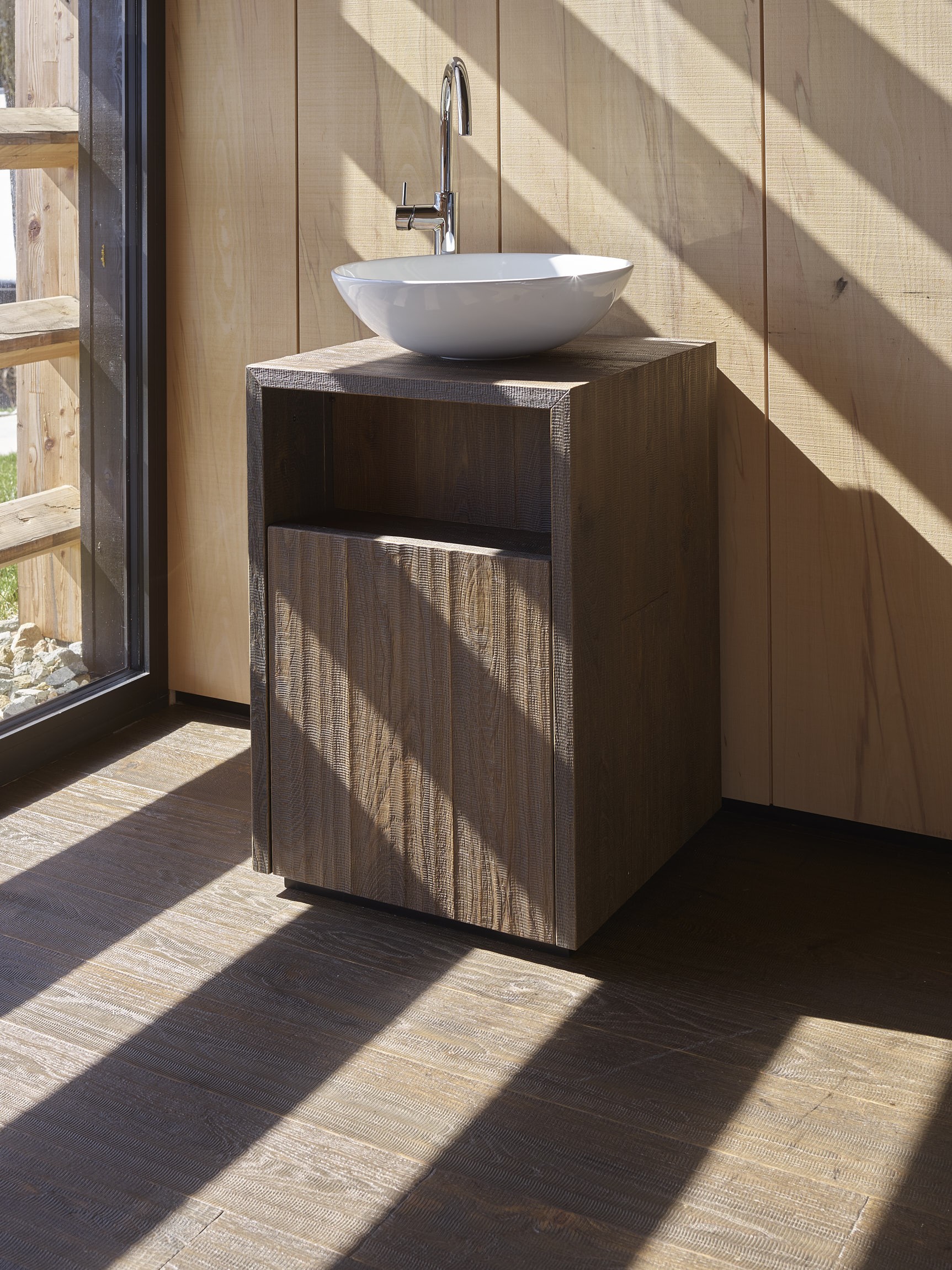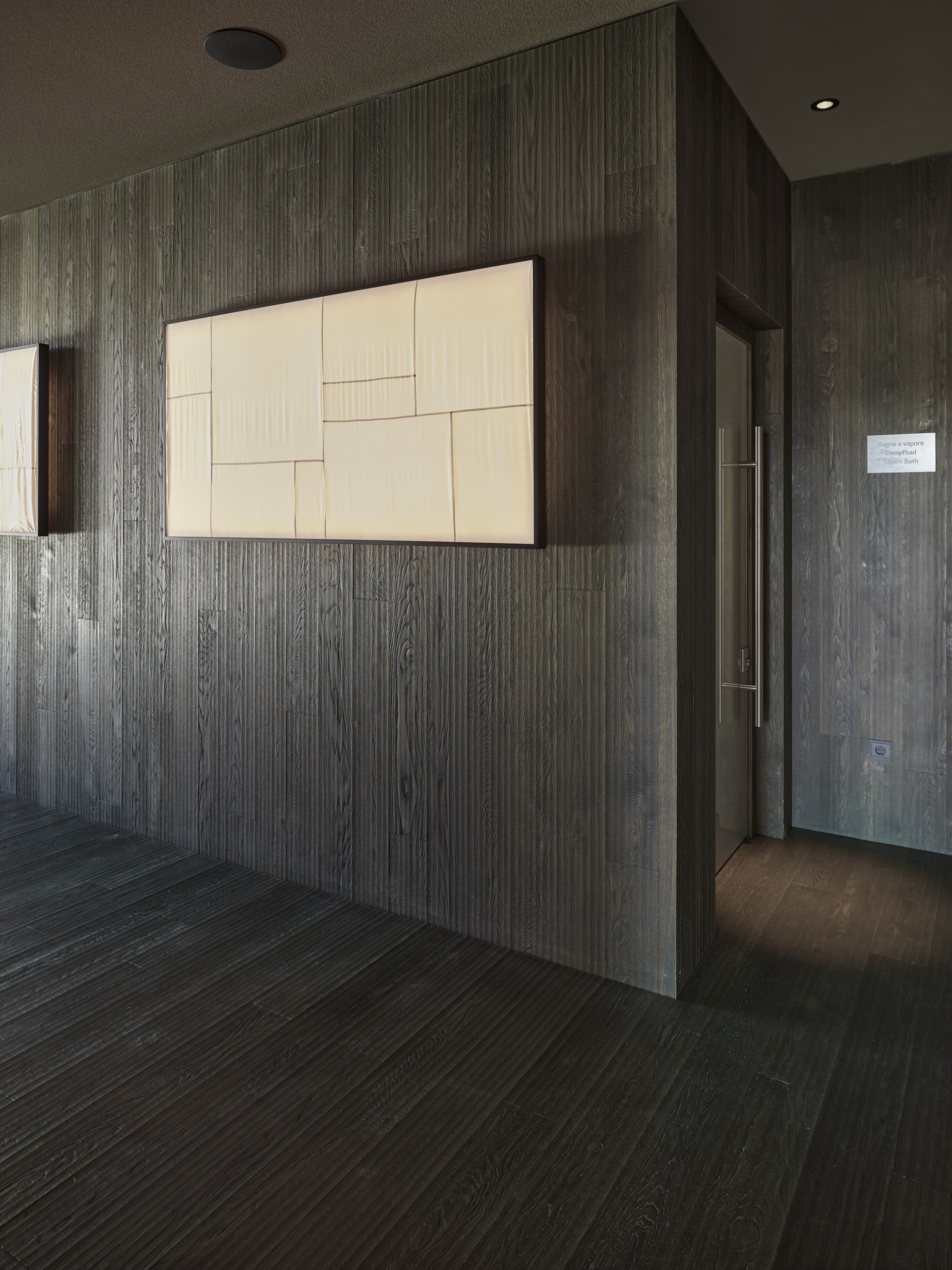 Le travail met en valeur le grain brut du bois, soulignant ses irrégularités par une marque physique, presque sculpturale. L’effet est à la fois archaïque et sophistiqué : la matière respire, absorbe la lumière et l’ombre, amplifie la sensation de bien-être tactile et visuel et stimule les sens. Pour assurer résistance et stabilité dans ces zones particulièrement sensibles aux variations thermiques, à l’humidité et au passage intense, c’est la structure en bois massif Triplostrato® de Fiemme Tremila qui a été choisie. Le traitement naturel BioPlus®, à base d’huiles et de résines végétales, garantit la durabilité et la salubrité du produit, tout en améliorant la qualité de l’air intérieur.