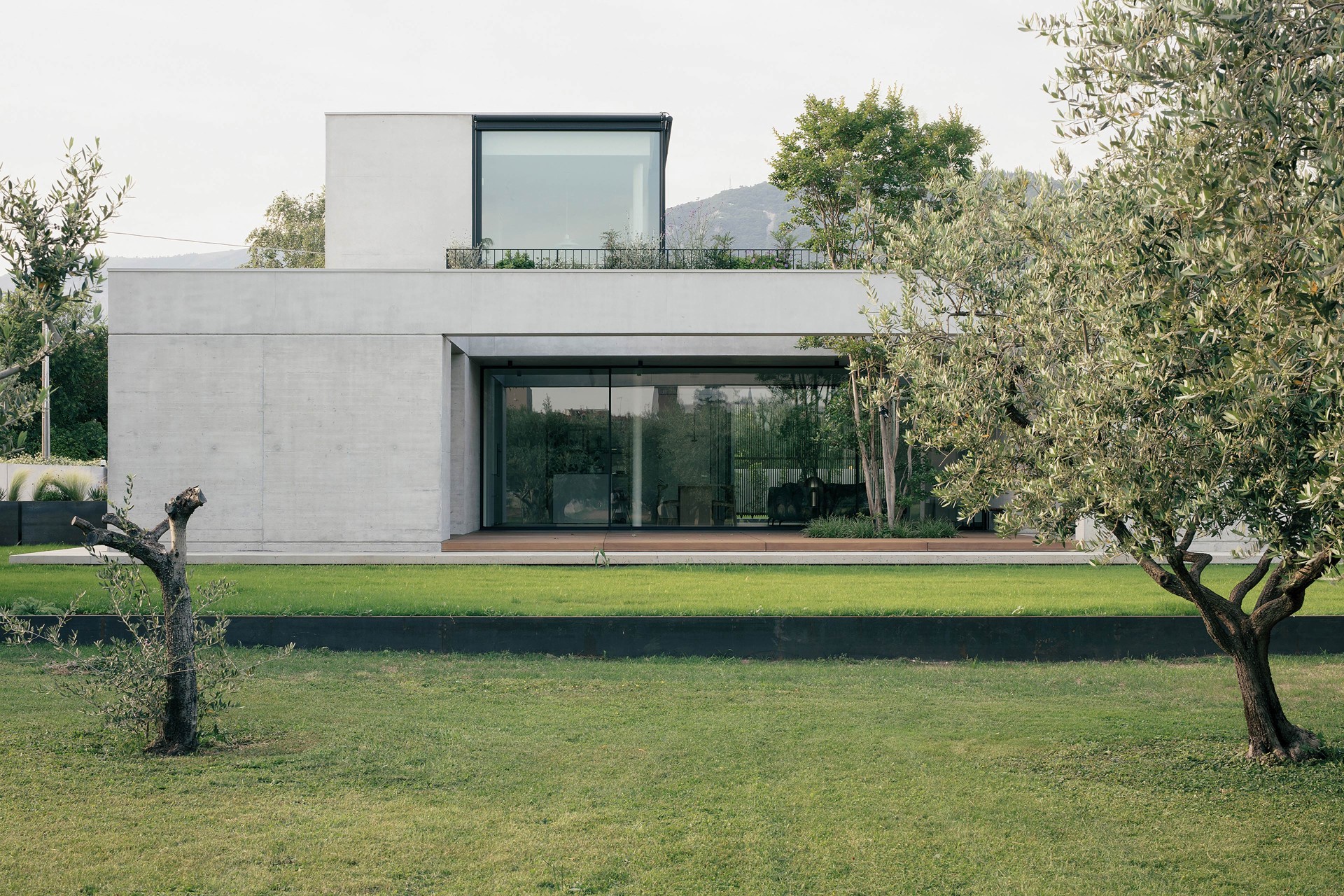 Ci troviamo a Bassano del Grappa, in una zona poco distante dal centro, ma a ridosso di un’area totalmente non edificabile, un polmone verde che si estende a perdita d’occhio. Affacciata su questo paesaggio si trova una villa minimale in calcestruzzo e legno, una scatola lavorata a vista con casseri in legno termotrattato.