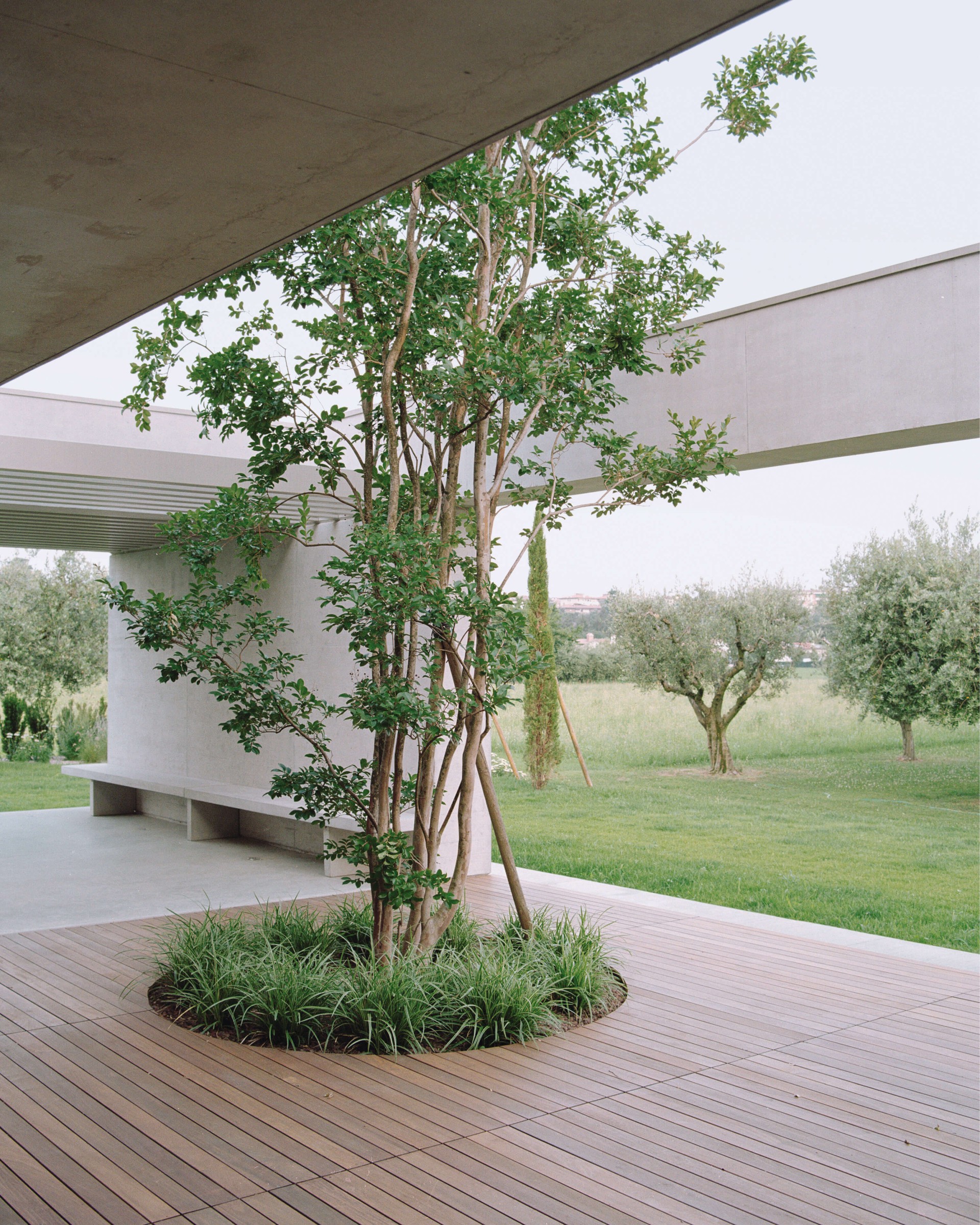 La richiesta della committenza è stata quella di dare vita a una casa moderna sì, ma che si integrasse perfettamente con il verde circostante, in un gioco di valorizzazione ed equilibrata integrazione. Una casa costruita attorno agli alberi, di cui è rispettosa custode.