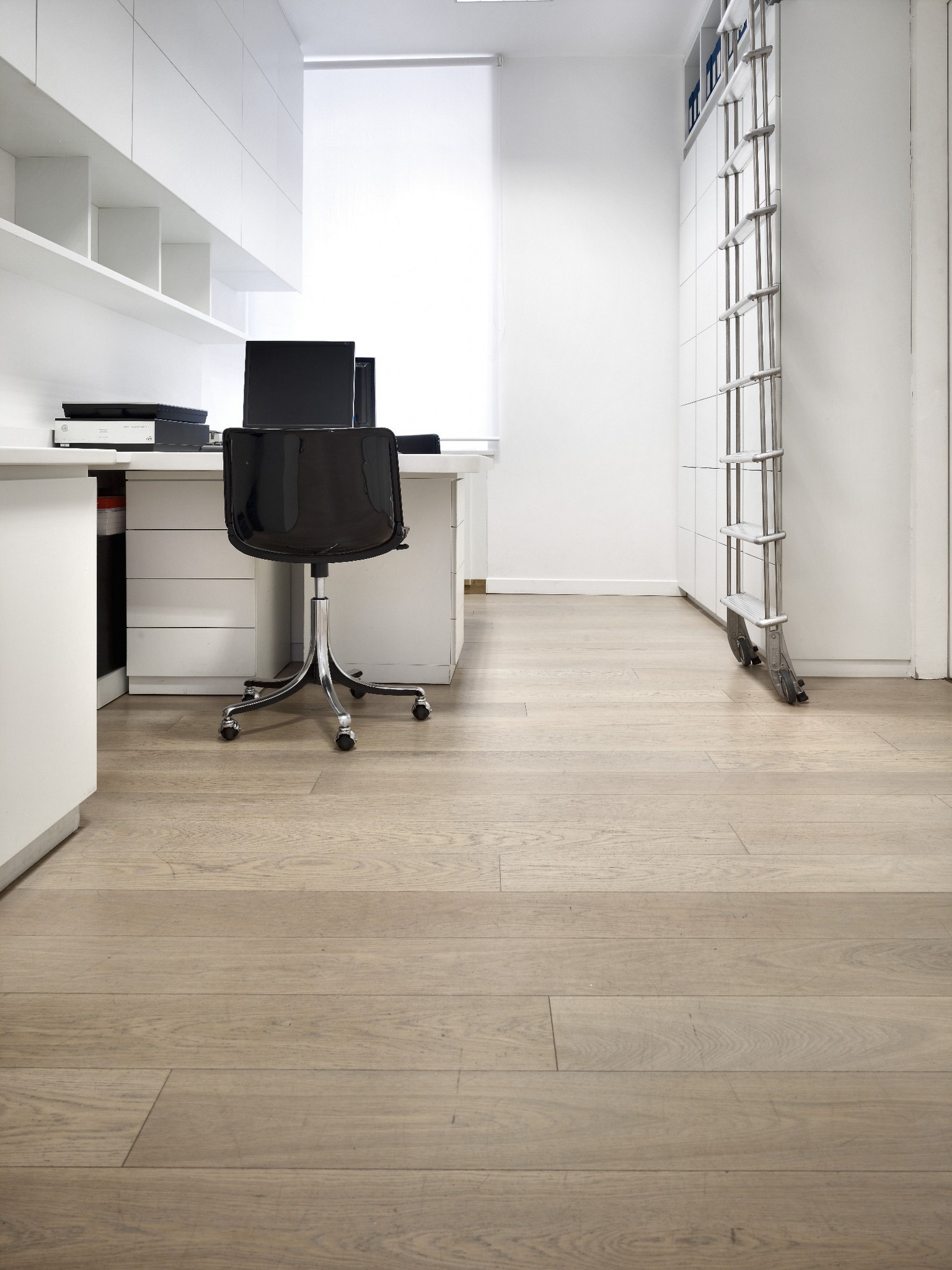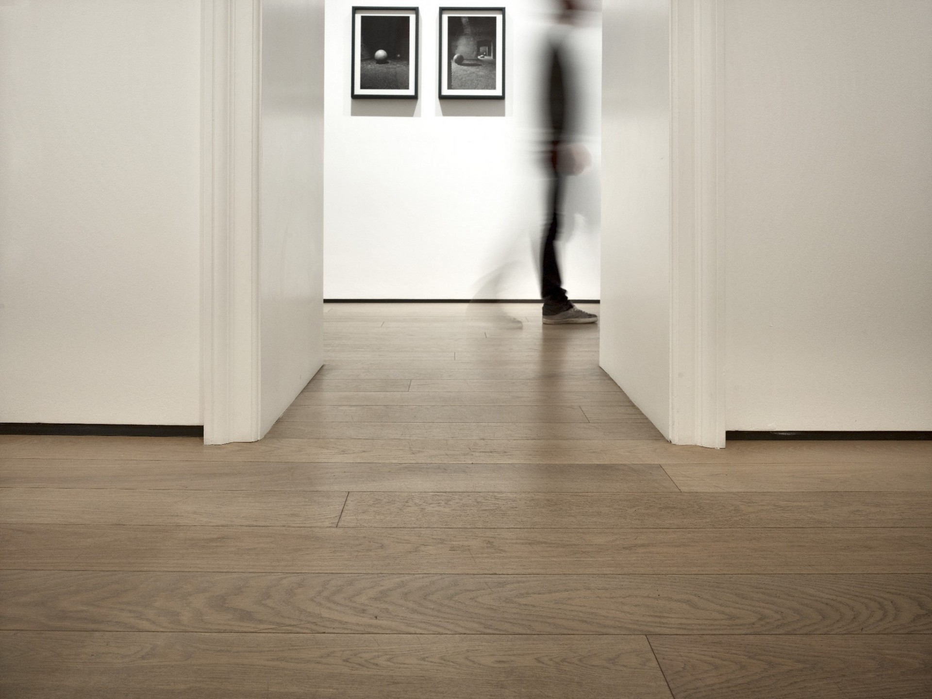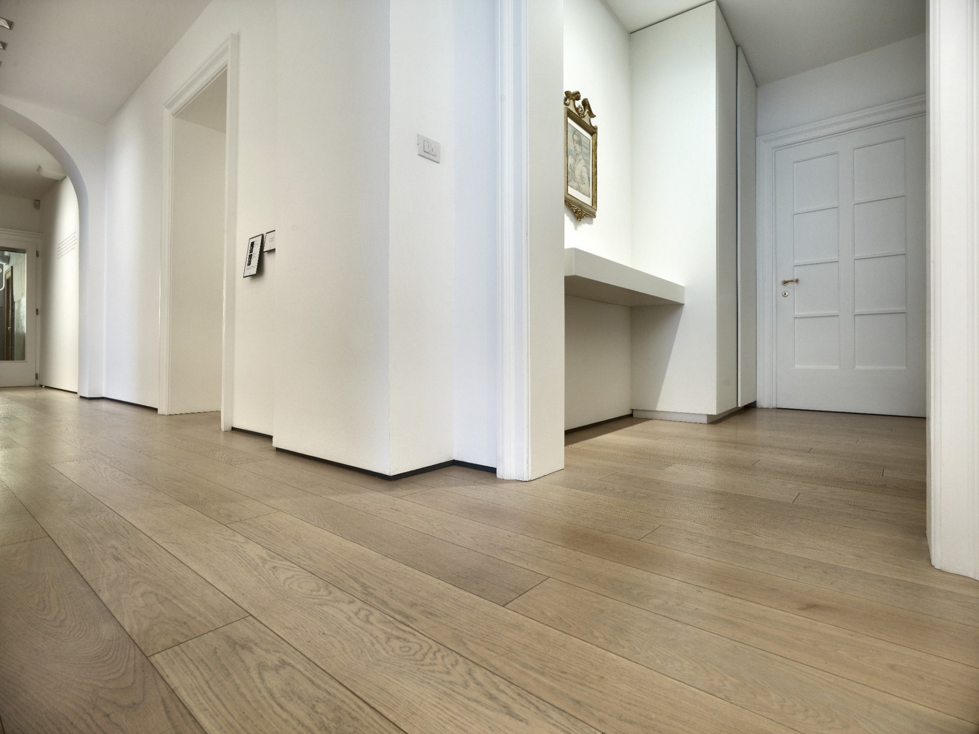 Il parquet a lisca di pesce risalente ai primi anni del Novecento è stato ricoperto e sostituito da un rovere Fiemme Tremila leggermente sbiancato, le cui lunghe assi danno un senso di continuità permeando tutti i passaggi architettonici tra una stanza e l’altra.